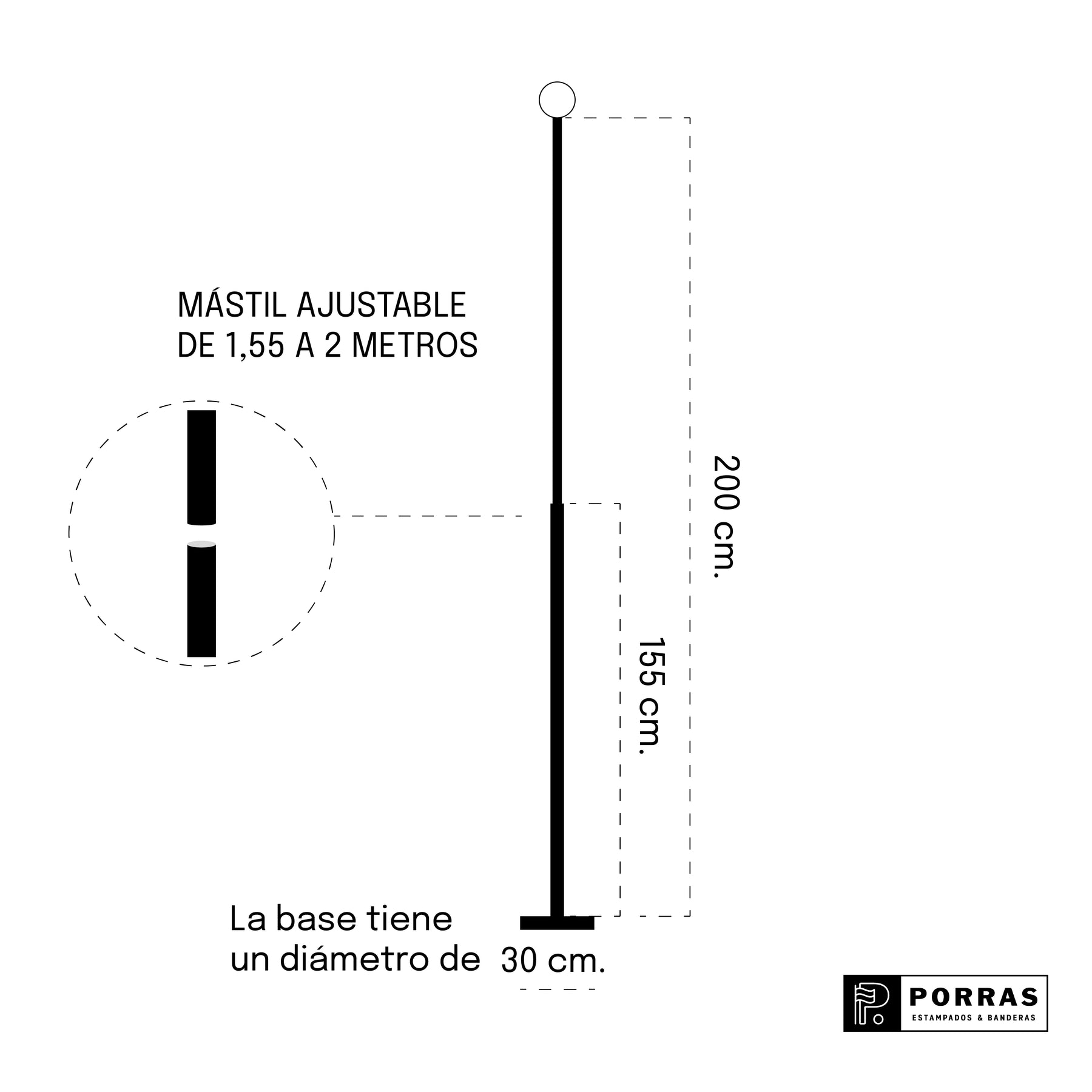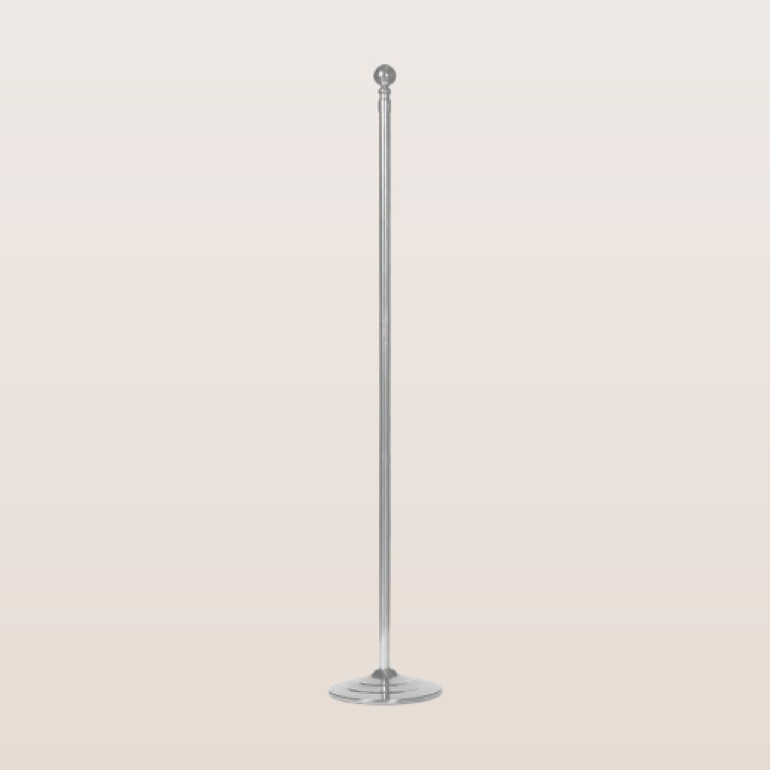 Mástil de aluminio con acabado plateado metalizado, altura regulable de 155 a 300 cm. Incluye peana resistente y pináculo esférico superior. Ideal para despachos y espacios interiores.