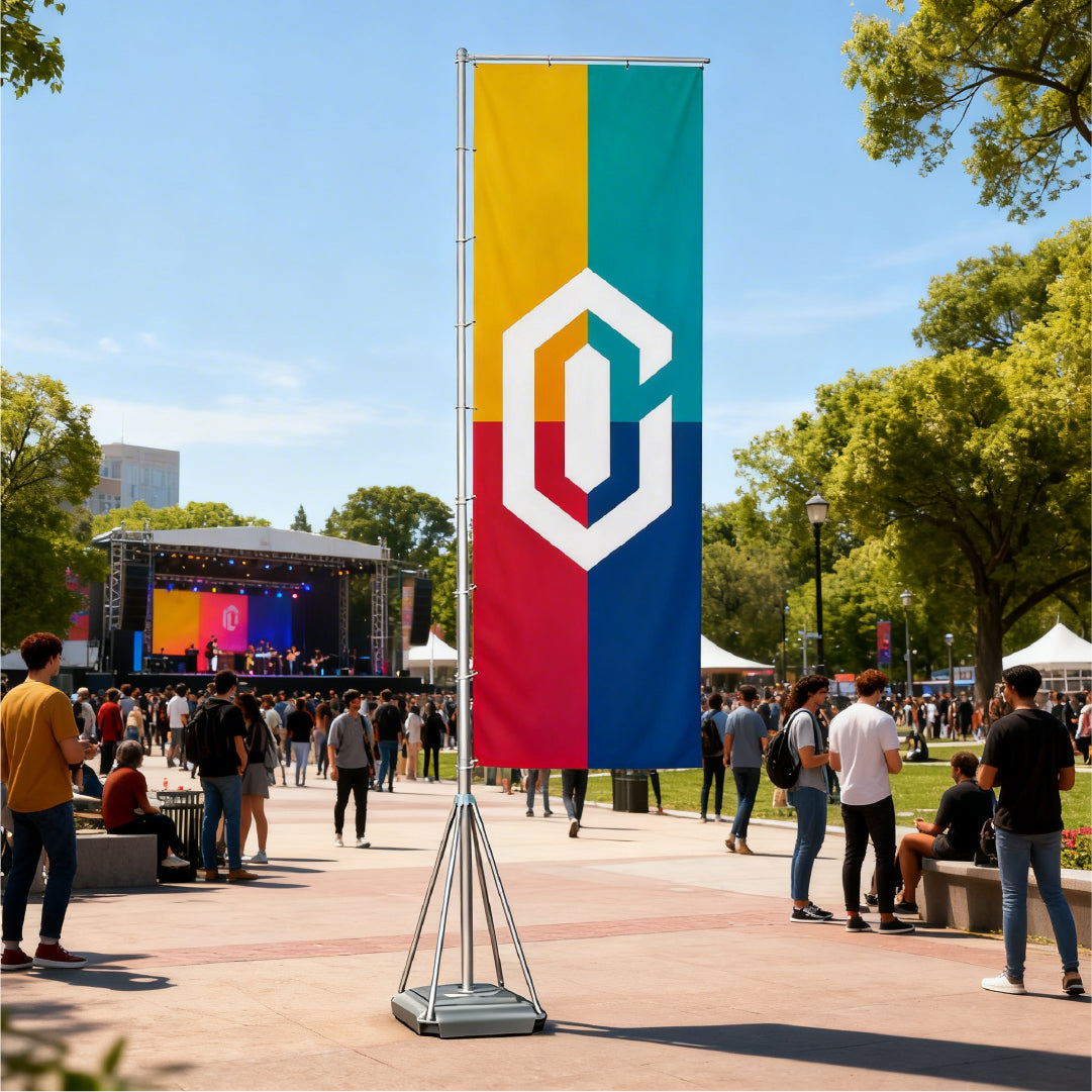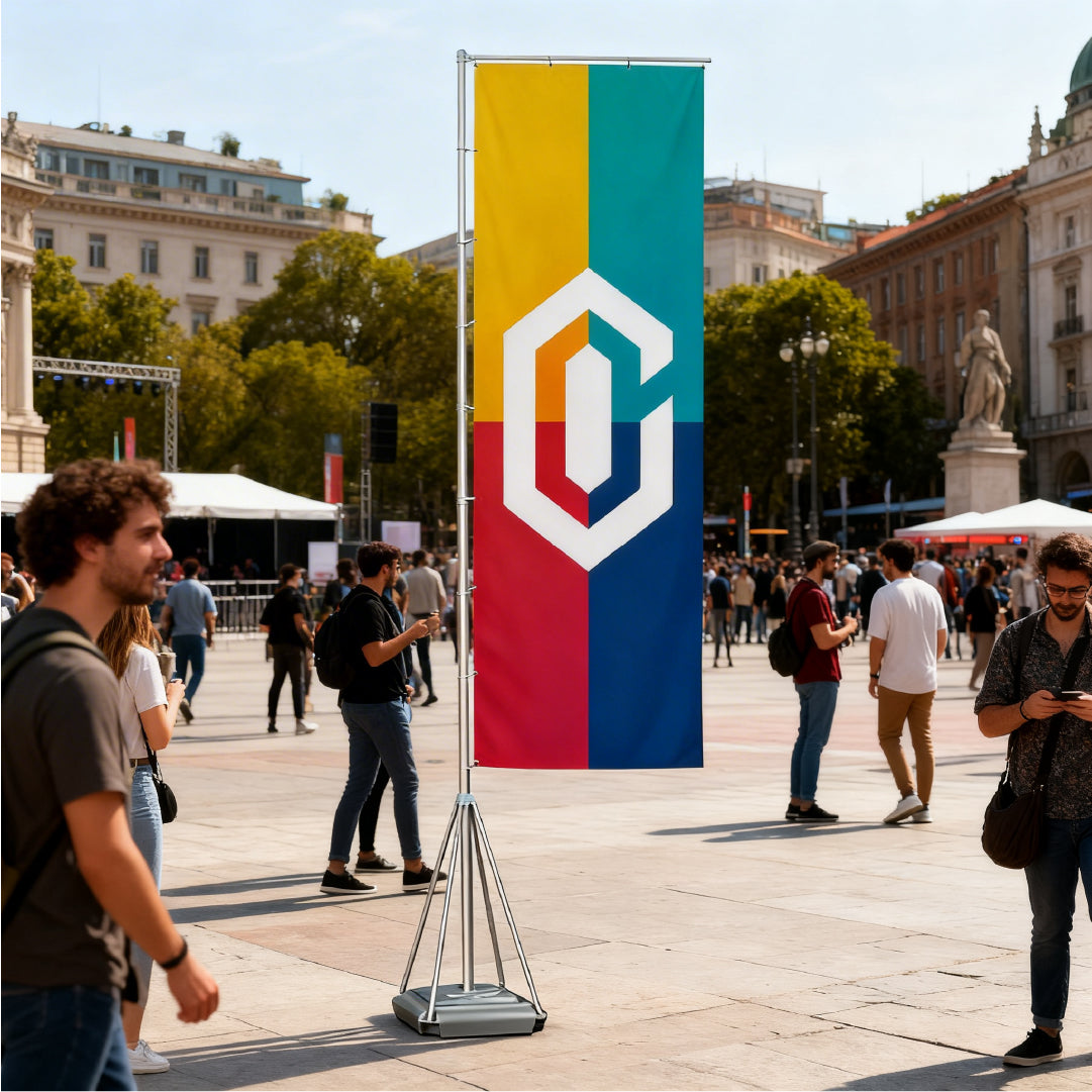 Bandera de gran formato (3 x 1,20 m) ideal para lograr máxima visibilidad. Incorpora cintas de refuerzo y ollaos metálicos (4 superiores y 8 laterales) que garantizan resistencia y fácil instalación.
