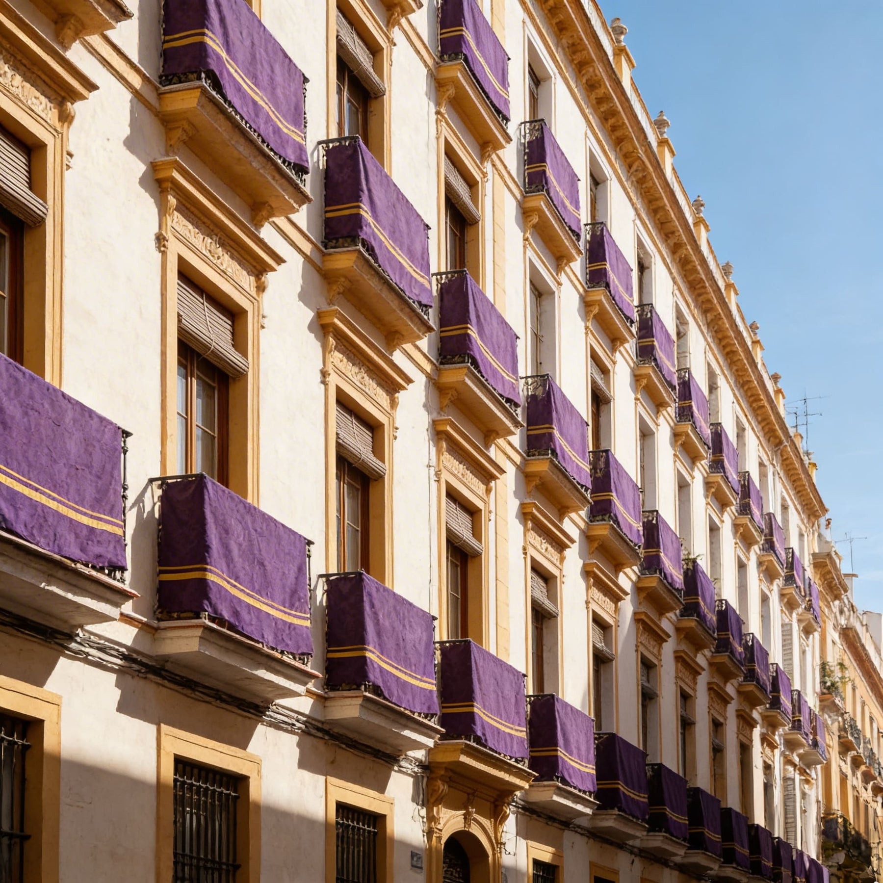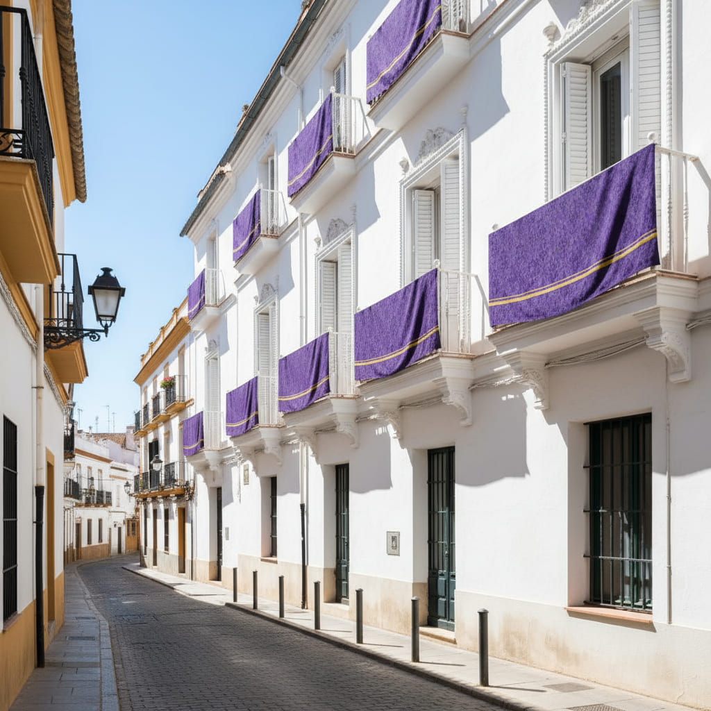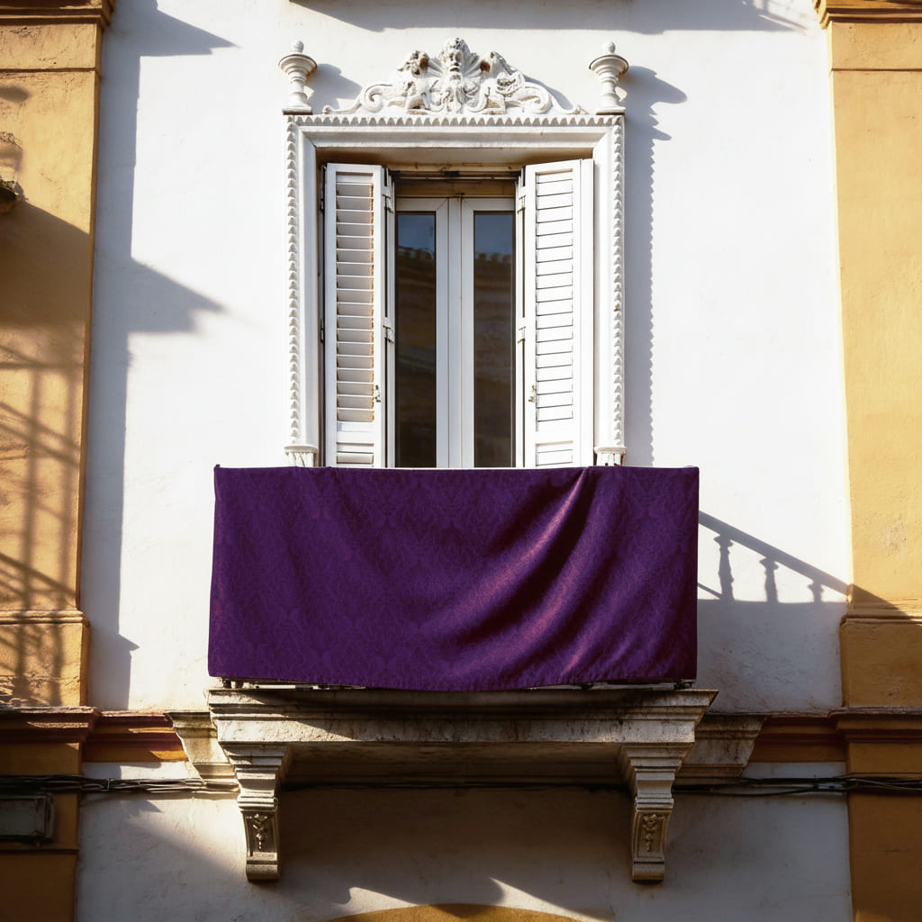Los reposteros y colgaduras religiosas están acabados con costura perimetral con lazos, en esquinas y laterales para facilitar la aplicación a cualquier terraza, balcón o ventana. Los lazos se colocan cada medio metros aproximadamente.